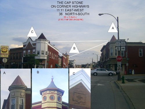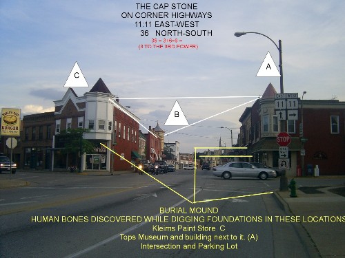 | Burlington Wisconsin LAND OF THE CANAAITES AND SERPENT RACE The Burlington Capstone Sits on hwy 11 and 36 11 goes east to west Revelations 1:1 or 11:11 You Decide 11 also runs into 36 which is Revelations 3:6 CONCORDANCE - SCRIPTURE TEXT. COM REVELATIONS 1:11 And there was given me a reed like unto a rod: and the angel stood, saying, Rise, and measure the temple of God, and the altar, and them that worship therein. (KJV) REVELATIONS 11:11 And after three days and an half the spirit of life from God entered into them, and they stood upon their feet; and great fear fell upon them which saw them. (KJV) REVELATIONS 3:6 He that hath an ear, let him hear what the Spirit saith unto the churches. (KJV) REVELATIONS 1:1 The Revelation of Jesus Christ, which God gave unto him, to shew unto his servants things which must shortly come to pass; and he sent and signified it by his angel unto his servant John: (KJV) For all of you that are familiar with my sites on interdimensional physics and the multi-verses, you have come to realize that we have some very unique phenomenon that spreads from the town itself to outlying areas. The town is built on at least 27 ancient burial mounds. Many townspeople experience hauntings. UFO sightings are a nightly occurrence. Underneath the town, leading to other towns in the area, is a maze of underground tunnels built by the ancient mound builders. And of course, my favorite, are the portals or doorways into other worlds, along with experiencing time/space distortions from them. . I had always suspected that this area was a place of 'magik and that the Burlington 'historical district' was made in the form of a pentagram and that our Center was sitting in the midst of it...which of course would explain why we have an active vortex in the Center and a lot of ghostly activities. . It took me years to find this pentagram , but several weeks ago, I finally made a breakthrough and found what I was looking for. Just as Mikael has demonstrated in his photos, this town is set up similarily. Except no copper and crystal staffs such as what he has set up.- but definately clues that an ancient race was here mining copper and using sacred ceremonies. I have also learned that Mormon Temple Endowment and Sealing rituals were derived from contemporary Masonic ceremonies. First to show you is a Circle of Og or Sacred Circle that I found , by accident, as I was viewing some aerial shots of Burlington. This is within the city limits of Burlington. |
