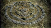 | The CIRCLE WINGS found on this cap stone is one of the most curious emblems of Ophiolatreian and may be recognised in almost every country where Serpent-Worship prevailed or prevails. It seems to have been a general symbol of consecration. The WINGS implied the MOVING or PENETRATIVE POWER of GOD, which pervaded all things. This he called LOVE This would usually appear of the portals of the Egyptian Temples. The Druids, however, transferred the symbol from the portal to the whole temple; and instead of placing the circle and serpent over the entrance into their sanctuaries, erected the entire building itself in the form of the ophite hierogram. Abury in Wiltshire, and Stanton Drew in Somersetshire, are interesting examples of this construction. The former represents the ophite hierogram with one serpent, the latter with two; the circle in each case being destitute of wings. The Burlington One shows the three circles The Center being the very smallest with statue in centre |