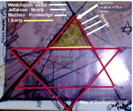 | Star of David or Pentagram Notice the top of the hexogram forms a pyramid and at the top of that pyramid is the capstone. The Burlington UFO and Paranormal Center lies right there in that capstone! In this old map of 1908 I was able to see the original streets . I discovered that the only original three streets running diagonally through this pyramid were Washington, Jefferson and Madison. At the base of the Pyramid was Liberty Street! If you are familiar with Masonic Lingo at all you will recognize that particular names have meanings. The same thing done here is mirrored at Mt. Rushmore with the faces of the presidents representing certain virtues. In the case of these 'three' streets (3 sides to a pyramid) you have Washington representing Virtue, Jefferson representing Liberty and Madison representing Knowledge. In Masonic Symbology - Follow the Clues - |