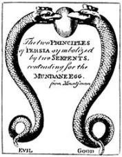 | This remarkable drawing shows the good and evil principles of Persia Ahura-Mazda and Ahriman contending for the Egg of the Earth, which each is trying to wrench from the teeth of the other. MPH |