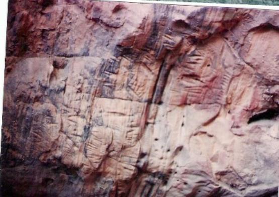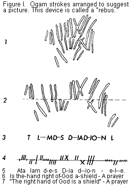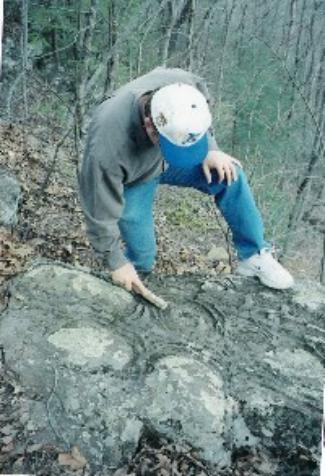| The above photo is of ancient Ogham inscriptions. This photo was taken in Powell County,Kentucky by John Payne Photo to left is another example provided by Barry Fell of a rebus on the Horse Creek Petroglyph. Credit: Arnout Hyde, Jr. |