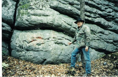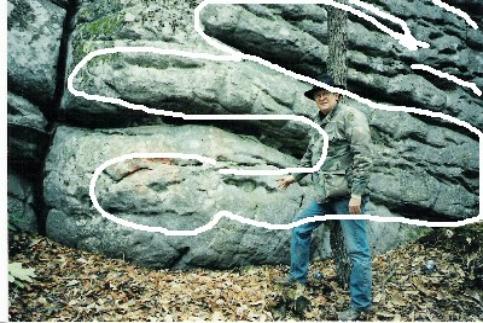 | Following are some 1 minute AVI video clips I received from James Scott when Brad and I were in Kentucky. Clip One - The Cut Stones 1 minute 5 sec Note how the stones are cut - indicating a temple area of great antiquity. Clip Two - Bull Rock John Swift calls it the Bull Rock - James Swift the Buffalo - It is definately carved with horns. Judge for yourself . Clip Three - The Cave. This is the cave that Brad went into . For photos and further reading on this cave click here and go to the following site. The entrance leading down into the cave at one time had steps carved into the rock . These steps are no longer there, due to a cave-in. Clip Four - Bull Rock and the Ogham Inscriptions Scott points out the Bull Rock and the Ogham Inscriptions . |