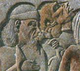 | Syrian and Hittite Prisoners in the tomb, south wall of the second court, circa 1325 BC. The Egyptians took care to portray their enemies as accurately as they could: On the left, a pair of Indo-European Hittites, and on the right, Semitics from Syria. |