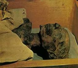 | A well preserved body from the pre-dynastic period in Egypt, circa 3,300 BC. Buried in a sand grave, the natural dryness of the surroundings kept the body preserved. His red hair have been so well preserved that he has been given the nickname "Ginger" at the British Museum where he is kept on public display. Right: "Ginger's" head. |