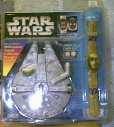 STAR WARS C-3PO WATCH AND CASE C-3PO's Face Flips Open to Reveal The Time C-3PO's Eyes Light Up Includes Millennium Falcon Collector Watch Case Millennium Falcon Opens for Easy Watch Storage Back of Package has Behind the Scenes Info on Character C-3COP and Actor Anthony Daniels TM 1996 Lucasfilm ltd Manufactured and copyrighted 1996 Hope Industries Inc. Price 14.99 CLICK HERE FOR LARGER IMAGE