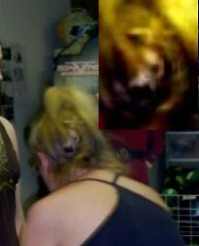 | As I was doing some energy work the other night , I had several people photographing me so that we could document the energy created. Several photos was taken of an object on the back of my head that appeared during the ceremony. Whatever this head is - it also has a pefect cross above it. It also seems that the dark circle around the head may be a portal that I have created . |