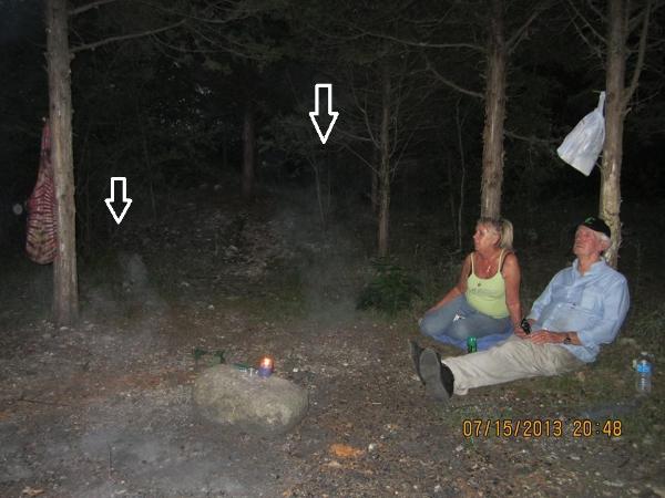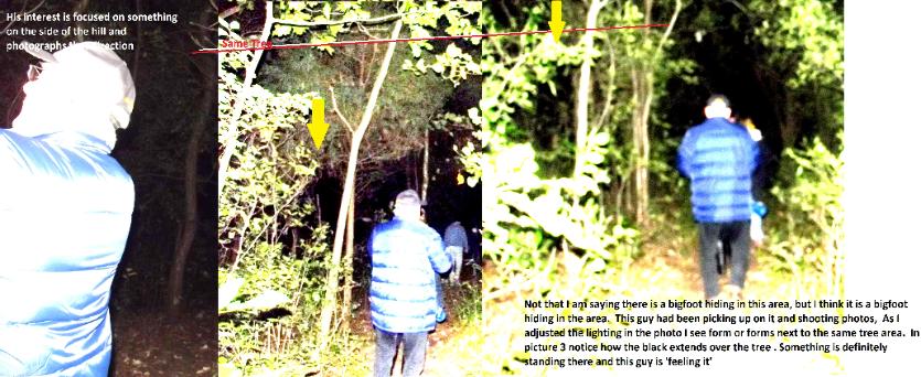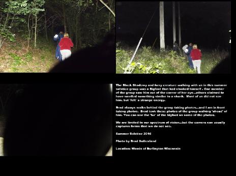 | This Bigfoot was following us on the tour - walking in front of Brad Sutherland.In the photo you see his form and hair as a dark shadow in front of Brad's Camera..lowerright. Jay Rusanda actually saw the Bigfoot in physical - Others viewed him through the camera. More info on this encounter in my book Portals - Gateway to the Multi-Dimensional Worlds |