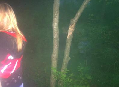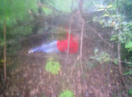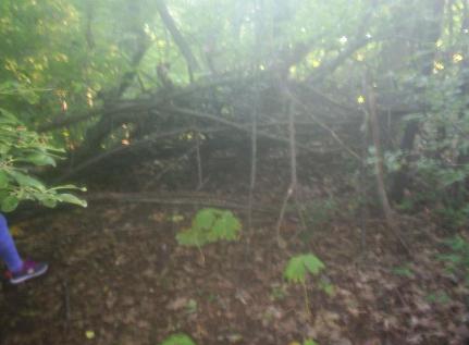 | On the back side of the woods, we found a Bigfoot Structure that was built over a portal that opens and closes. When it is open, everything is seen blurry, when it closes, the blur goes away as seen in these photos. Mary is laying in the structure to the left. This structure over looks Burlington Egg Plant and we believe one of the scouts watches the plant . At the end of their shift, the plant throws waste products away and the bigfoot go down and eat it. We have found a path from this structure leading towards the egg plant. |