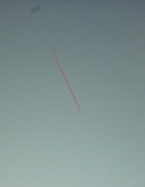 | This photo was taken just at dawn on 8 -15-04 Notice the red line that comes between cigar shaped object to top left and smaller white object from bottom right. No..we did not draw the red line in. This is an actual event Mary Sutherland photographed showing a laser beam coming down from s cigar shaped UFO to a white cylinder object below. |