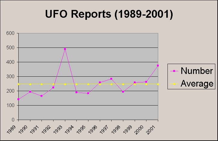 Burlington UFO and PARANORMAL Research and Educational Center Living in the Light by Mary Sutherland HUGE INCREASE IN UFO REPORTS IN CANADA News Release: 25 February 2002 Study Finds Huge Increase in UFO Reports in Canada in 2001 There were 42% more UFO reports filed in Canada in 2001 than 2000, according to the findings of a national study released today. "There was a huge increase in the number of UFO sightings last year," says science writer Chris Rutkowski, editor of the study. "There were 374 UFO reports made in Canada in 2001, or about one UFO seen somewhere in the country each day. We are not sure why there was such a large rise in reports last year, since the trend began earlier than September 11th." Rutkowski is research coordinator for Ufology Research of Manitoba (UFOROM), a volunteer civilian group that gathers and studies UFO reports made to Canadian organizations and government agencies. UFOROM has been publishing an annual survey of Canadian UFO sightings since 1989 and has accumulated more than 3200 Canadian UFO cases since the beginning of the last decade. They look at details such as where a UFO was seen, the time of day, its colour, shape and observed behaviour. Other findings of the 2001 study: In 2001, more UFOs were reported in August than any other time of the year. About 15% of all UFO reports were unexplained. This percentage of unknowns falls to about 5% when only high-quality cases are considered. Most UFO sightings have two witnesses, meaning that sightings can usually be corroborated by someone else. In 2001, the typical UFO sighting lasted about 15 minutes. BC, Ontario and Alberta logged the most sightings, although all provinces and territories had reports last year, including 5 cases in Nunavut. More UFOs were reported over Vancouver and Ottawa than any other Canadian cities. "People continue to report UFOs quite regularly," explains Rutkowski. "Most UFOs have simple explanations, but the unexplained ones are still interesting, although not necessarily from Mars. Over the years, report numbers have been increasing, even though in this advanced technological age, science tells us that UFOs aren't real." He adds: "This research can give scientists the raw data needed to properly evaluate this popular social phenomenon that is so pervasive throughout our culture." For further information, contact: Chris Rutkowski, editor, e-mail: rutkows@cc.umanitoba.ca Geoff Dittman, data analysis, e-mail: aristotl.geo@yahoo.com The study is available online at: www.geocities.com/aristotl.geo |