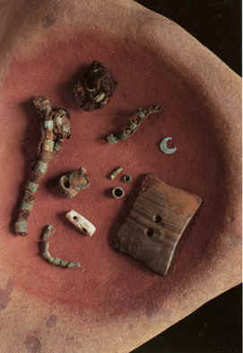 Ornamental artifacts include beads, a clasp or clip, bracelet, rings, crescents and celts. Sixty beads, found