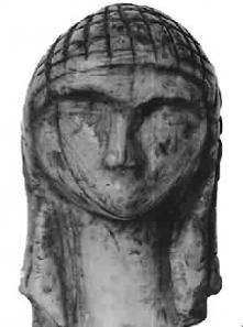 | A small ivory head of a female figure with delicately carved features and stylized long hair, found at Brassempouy in France - circa 22,000 BC. This piece is exceptionally valuable as racial characteristics are clearly identifiable in the face |