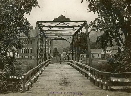 | Photo of the Old wooden bridge that crossed over the Kickapoo River. On the other side of the bridge you see the four classroom brick school house. Both the bridge and school have been torn down and replaced . |