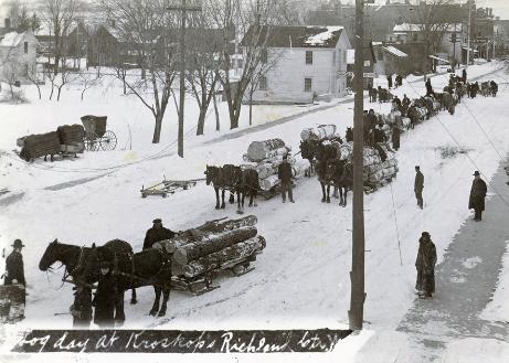 | Logging was and still is another industry for Gays Mills . What is now the pioneer park used to be Gays Mills Saw Mill. Long gone, but for some not forgotten. The following photo is from Richland Center, but the picture gives you an idea of the timber business in that area. |