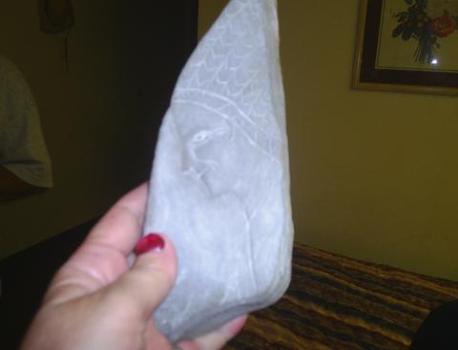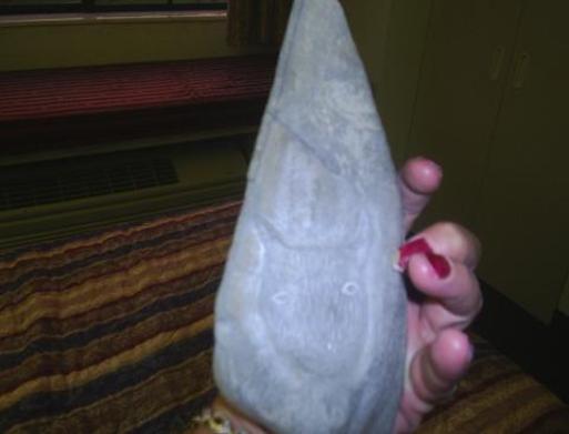 This beautiful stone carved artifact was found near the temple area . Photo to left shows the Front side . The bottom photo shows what could be either a cat, panther or possibly a wolf engraved on its backside. This could be either a totem of the owner or representative of the owners clan. Photograhed by Mary Sutherland |