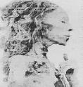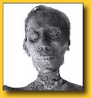 A well preserved body from the pre-dynastic period in Egypt, circa 3,300 BC. Buried in a sand grave, the natural dryness of the surroundings kept the body preserved. His red hair have been so well preserved that he has been given the nickname "Ginger" at the British Museum where he is kept on public display. Right: "Ginger's" head. |