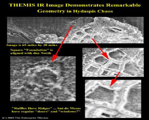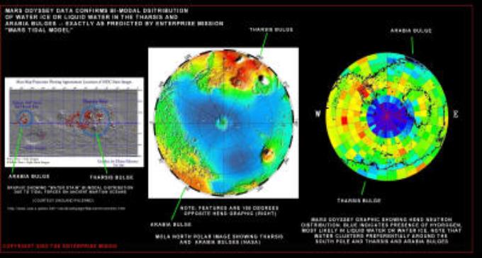The most significant image presented was of the Hydaspsis Chaos region of Mars. If that sounds familiar, it should, it is just a few miles from the Hydroates Chaos Region of Mars (0.9 north, 34.3 west vs. 2 degrees north, by 29 degrees west), the location of the stunning Phobos 2 image we posted in our story yesterday. So, as we expected, we got an IR image of virtually the same area exactly 13 years to the day from the moment Phobos 2 took its picture. Cute, huh? And what a picture. As Christensen haltingly displayed the image to the assembled media, he made no mention of the stunning regularity of the terrain -- especially considering it's dubbed "Chaos"! Infrared close-up. Bright areas are warmer, darker areas are colder. North is right in this image. What's most striking initially is the incredible consistency of the "channels" between the "sand covered mesas" (how does sand stay on top of a flat "mesa" that is buffeted by 300 MPH winds from time to time?) in the image. The channels all seem to be about the same width, and remain incredibly consistent for miles. The mesas themselves are shockingly geometric, not really what one might expect from a fluvial erosion process. But the Devil of course, is in the details. "Quick and dirty" close-up enhancements, done just hours ago, show some very unusual features of these "mesas." There are regular, geometric "notches", or even openings, in some of them, and others show signs of being buried foundations for larger objects. A little further up in the image is a strange looking "crater" plastered on top of a dark rectangle with incredibly square edges. Considering that this is not aligned with the image scan, but is aligned with actual North/South, we're inclined to doubt this is an image artifact or natural formation. We're also reluctant to conclude that the "mesas" are just that, and we'll reserve judgment until we have a chance to look for a visible light image of the same area. Unfortunately, this was not provided at the press briefing, as is customary, so it is tough to find such an image on short notice. However, we're reasonably sure that the Viking image below is of the same area, with the "mesas" in question near the top (the Phobos 2 image area should also be within the boundaries of this image). The visible light camera on Odyssey should be able to provide color imagery at least 50% better than the best Viking, so hopefully we'll be able to pinpoint the exact location of this IR image eventually. But as cool as the IR data was, the Gamma Ray Spectrometer data was even more exciting, at least to us. The GRS has a very coarse resolution and isn't fully deployed yet, but the team, led by Dr. William Boynton, gathered some data anyway while the instrument was still in its "parked" position. Of the data, the most crucial was the information gathered on "High Energy Neutrons". These types of Neutrons are typically absorbed by hydrogen -- a key component of water and water ice -- so by measuring areas with little or no "HEND" return, it is possible to determine just if, and how, water is distributed on Mars. High Energy Neutron map from today's press briefing. Blue areas indicate presence of very few neutrons of this type, indicating the presence of liquid water or water ice. South Polar cap is in the center. Other blue areas correspond to Tharsis and Arabia bulges, precisely as predicted by Mars Tidal Model. As it turns out, there is a hell of a lot of water, or water ice, on Mars (NASA has argued it is ice, but already Viking scientist Gilbert Levin has declared victory and argued persuasively it is liquid water, not ice) . Most of it is clustered (as expected) in the South Polar cap, but huge amounts of it are also present on two specific (and bi-modally opposed) areas of the planet -- -- the Tharsis and Arabia bulges. Most of you will recall that these are the two areas where the so-called "water stains" we first reported on back in July 2000 were found in greatest abundance. Thanks to the work of Jill England and Efrain Palermo, who mapped the global distribution of the "stains," we discovered that they clustered preferentially around these two enormous bulges in the Martian crust. This observation led us to conclude that the bulges were in fact artifacts of a former tidal lock relationship between Mars and a parent planet, and that the water stains were the remnants of an ancient ocean, bi-modally distributed and held in place by the tidal forces. We then published these findings in an 46 page paper posted on our site last year. Because of our specific prediction more than six months ago in our paper, that Odyssey would find exactly this anomalous (beyond our model) water distribution, we can state categorically that these findings constitute absolute, inviolable confirmation that our model is correct. It also proves that the work done by Palermo and England is correct, since the water distribution corresponds precisely where they have found what are now proven water stain images. What was stunning was that neither Boynton nor any members of the assembled press, either because of ignorance or timidity (is there any American institution that has fallen into a greater state of disrepair than the Fourth Estate?), made the slightest note of the fact that the water -- inexplicably for the established conventional models of Mars evolution -- was distributed on two such prominent features of the Martian landscape. This does not change the fact that there is nothing -- absolutely nothing -- in any conventional model that can account for this distribution. The only explanation that fits the data is our Tidal Model. Even after they had hyped the data to be presented as a "whole new Mars," and "tremendously exciting," not one of the scientists bothered to explain just why any of this constituted a "whole new Mars" -- --and nobody asked!!!! This astounding lack of curiosity by the press to as just what made this data so exciting just played r