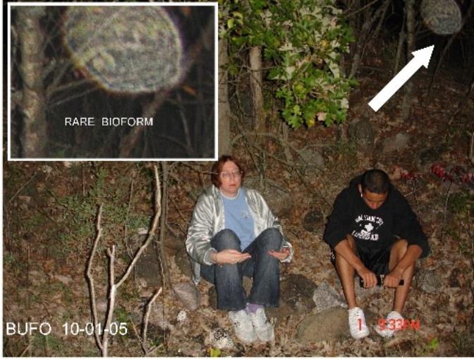 The photo above shows a bioform at the top right hand corner. I cut and enlarged it so that you could get a better view of this rare 'sky creature'. Apparently it was attracted to the energies being generated in this pit. Another example of a bioform can be seen in the photo below.