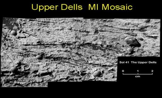 The sinuous curves seen in the face of this rock, known as the Upper Dells, are definitive evidence that standing water was moving on the Martian surface in the past. The image is a patchwork of many smaller images taken by Opportunity's microscopic imager. CREDIT: NASA/JPL.
