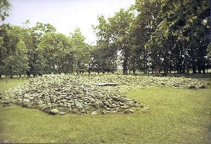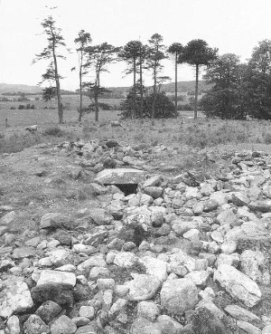 | Scotland - Dunchraigaig - Cist & Cairn County: Argyll (Strathclyde) Three cists are contained within a massive cairn over 98 ft (30 m) in diameter and still standing to a height of 6½ ft (2 m). The southern cist is orientated ca. 035-215 degrees and is covered by a capstone measuring 13 ft (4 m) long. All three chambers were found to contain burials by cremation and inhumation |