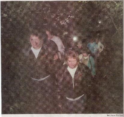 | This photo was taken by Mary Sutherland on one of our Haunted Tours. These people were paranormal researchers wanting a little taste of the haunted woods. Well they got that and a little more. The person in the foreground was sitting on the Manitou stones as I took the photo with his father and mother standing in the background. Note that he not only starts to seperate in the 3d position which is on the stone..but is sitting behind himself in another parallel dimension..and photo is clearer of him there than the 3d photo . His mother and father have also seperated and are standing next to themselves. Also again notice the light coming out of nowhere. in the background.. And note too the trees and stones remain the same. |