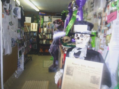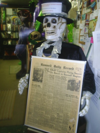 Coming through the Door of the Burlington UFO Center you are welcomed by our animated singing skeleton, holding a newspaper of the Roswell UFO Crash.
